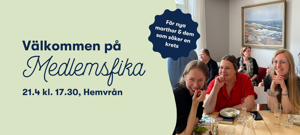Vi bjuder in till ett avslappnat medlemsfika i Hemvrån där du får höra mera om vad Helsingforsmarthorna gör, hur våra marthakretsar fungerar, ställa frågor och träffa andra nya (och blivande) marthor. Du är välkommen att titta in en stund eller stanna hela timmen.