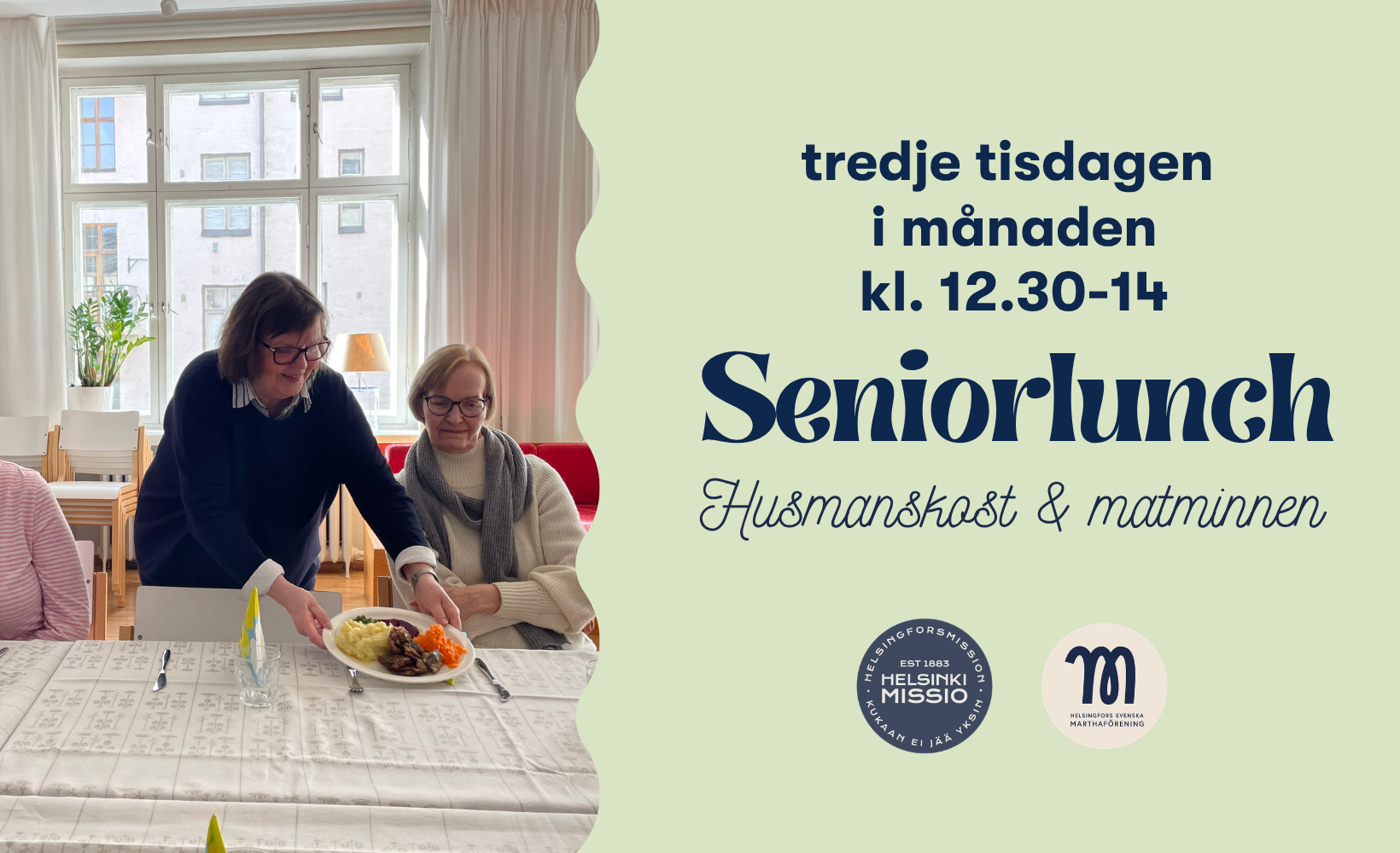 Äter du ofta ensam och saknar en matgemenskap? Vill du avnjuta husmanskost och prata om matminnen tillsammans med andra? Kom med på HelsingforsMissions och Helsingforsmarthornas gemensamma seniorlunch!